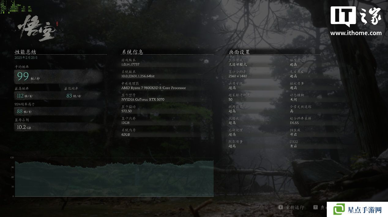 RTX 5070 在 2K 分辨率 + 超高画质 + 50% 超采样分辨率 + 高全景光追 + 帧生成下,游戏平均帧数为 99 帧,1% Low 帧 60 帧;