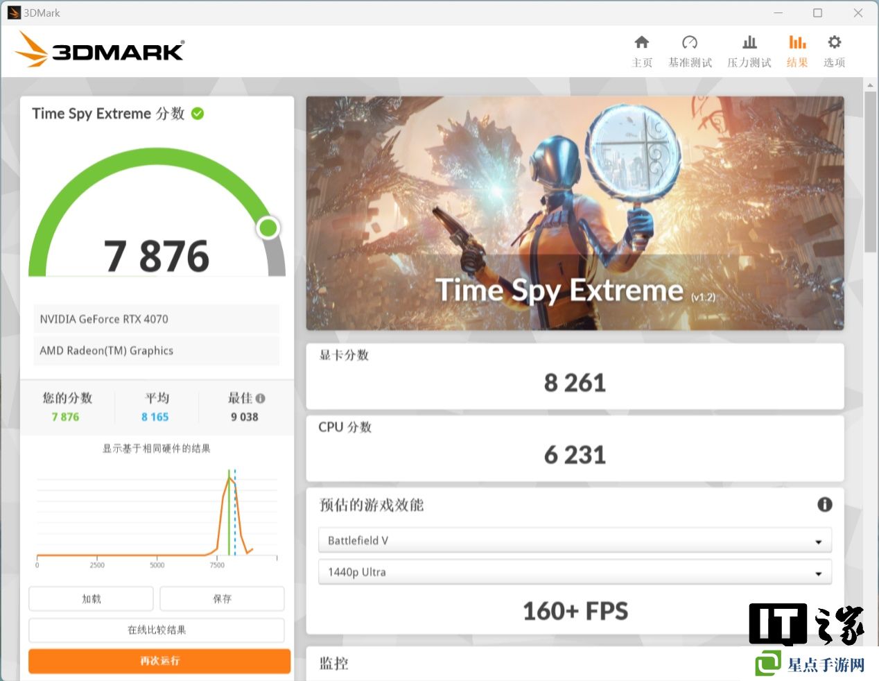 在 3D Mark Time Spy Extreme DX12 测试中,NVIDIA GeForce RTX 5070 显卡分达到了 10643 分,对比 NVIDIA GeForce RTX 4070 显卡的 8261 分,提升幅度约 28.8%。