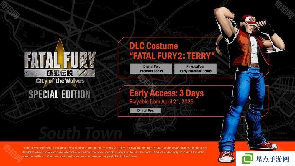 DLC 服装「饿狼传说 2:特瑞」重现了特瑞在《饿狼传说 2》的经典造型,将提供给 2025 年 4 月 23 日之前预购数位版的玩家作为预购特典,以及以兑换代码的形式附在产品包装内作为实体版的附带特典。
