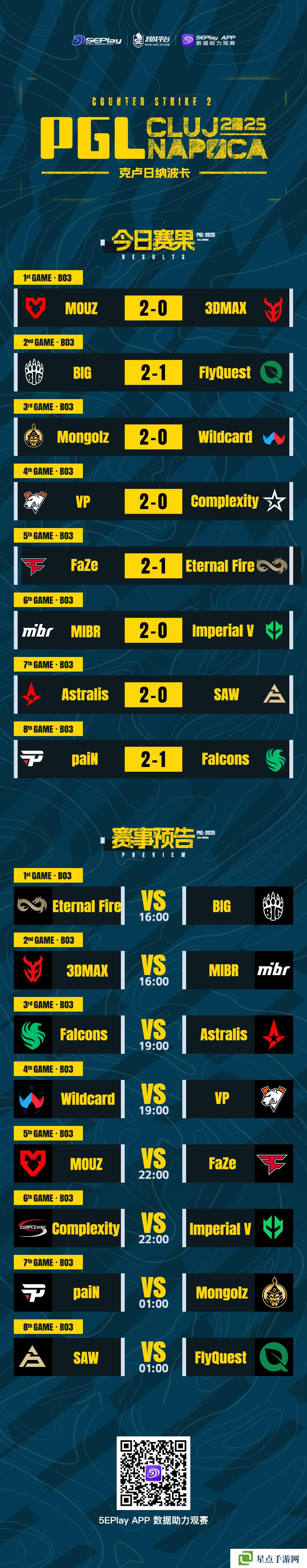 PGL克卢日-纳波卡 2025第二日比赛告一段落,在第二日比赛中,paiN成为新晋黑马杀出重围,他们以2-1险胜Falcons,来到2-0组。同样在第二日取胜并晋级2-0组的还有MOUZ、The MongolZ、FaZe。除此之外,BIG、Virtus.pro、Astralis、MIBR则也是在今日取胜,从0-1组进入1-1组。明日1-1组将会有Falcons迎战A队,2-0组则会迎来晋级之战,MOUZ对阵FaZe。以下为今日赛果、明日预告一览: