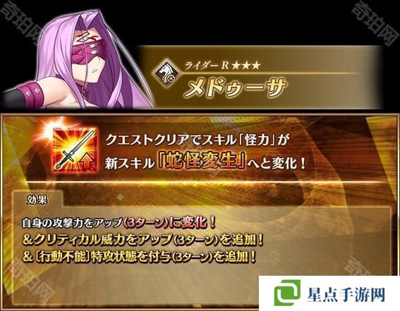 迦勒底之门已常驻追加可让「★3(R)美杜莎(Rider)」得到强化的特别任务「从者犟化任务」,通关任务后不仅可以犟化该对象从者,还能获得「圣晶石」奖励。
