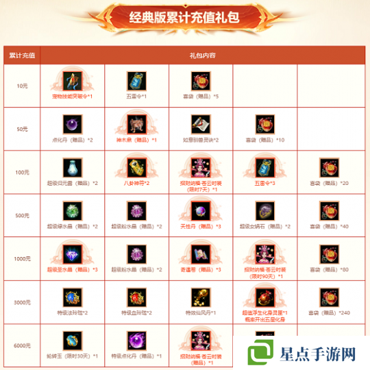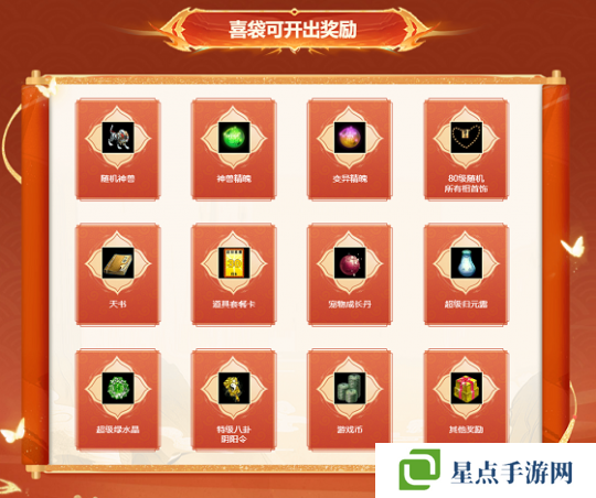 经典版的道友有机会开出随机神兽、神兽精魄、变异精魄、80级随机所有相首饰、道具套餐卡、商城道具,游戏币等。