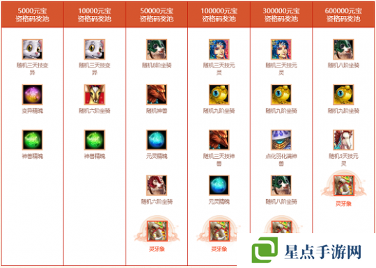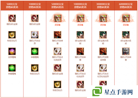 普通版玩家有机会赢得八阶坐骑灵牙象、随**阶或九阶坐骑(仅至尊系列)、随机元灵、点化羽化满的神兽、随机变异等奖励。