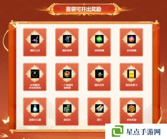 喜袋内含丰富奖励,普通版的道友有机会开出随机元灵(元灵从赤天、混沌、笛舞、降魔、夫诸、震魃中随机开出)、随机神兽、变异、神兽精魄、变异精魄、满属性装备箱、80级随机所有相首饰、道具套餐卡、商城道具、道行,游戏币等。