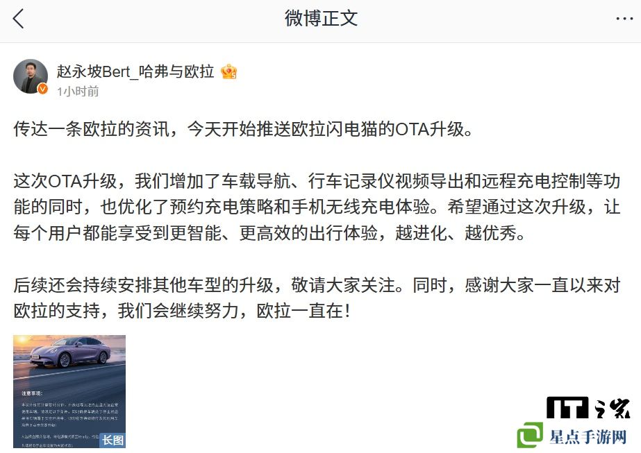 本站 3 月 3 日消息,据长城汽车哈弗、欧拉品牌总经理赵永坡分享,欧拉闪电猫今日起将获第四次 OTA 升级,包含 6 项新增功能和 2 项体验优化。