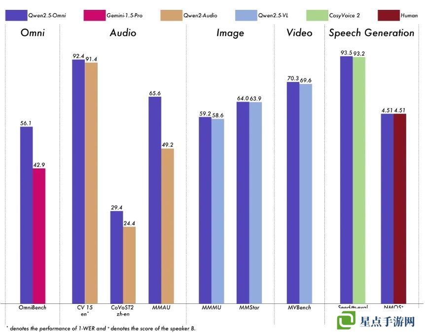 在多模态任务 OmniBench,Qwen2.5-Omni 达到了 SOTA 的表现。此外,在单模态任务中,Qwen2.5-Omni 在多个领域中表现优异,包括语音识别(Common Voice)、翻译(CoVoST2)、音频理解(MMAU)、图像推理(MMMU、MMStar)、视频理解(MVBench)以及语音生成(Seed-tts-eval 和主观自然听感)。