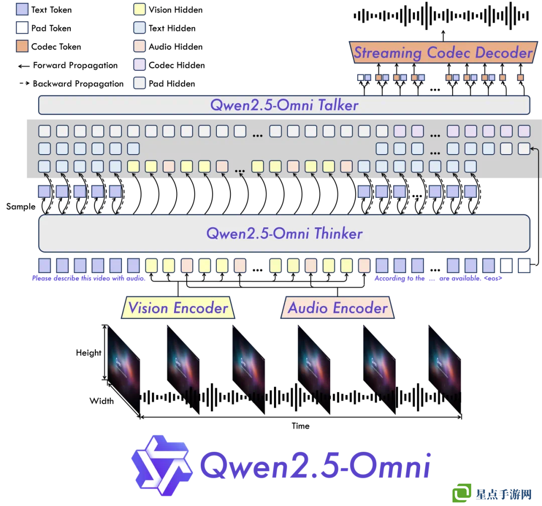 全能创新架构:Qwen 团队提出了一种全新的 Thinker-Talker 架构,这是一种端到端的多模态模型,旨在支持文本 / 图像 / 音频 / 视频的跨模态理解,同时以流式方式生成文本和自然语音响应。Qwen 提出了一种新的位置编码技术,称为 TMRoPE(Time-aligned Multimodal RoPE),通过时间轴对齐实现视频与音频输入的精准同步。