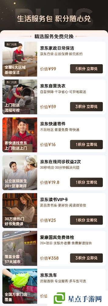 比如,京东 PLUS 会员用 3 积分可以免费兑换一次价值 358 元的体检服务,5 积分可以免费兑换一次价值 99 元的家政保洁服务(快递 1 积分)。