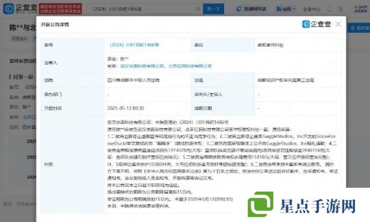 近日,据企查查APP显示,武汉侠面科技有限公司、北京红洞科技有限公司涉嫌虚假宣传纠纷案将于5月12日开庭。据悉,武汉侠面科技有限公司曾登记有多项鹅鸭杀相关著作权,并且备案有gogoduck.yzz.cn域名。