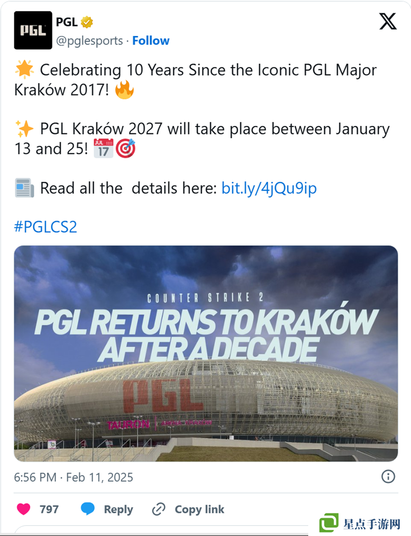PGL宣布波兰克拉科夫市将成为其2027年首场赛事的举办地,比赛时间为1月13日至25日。