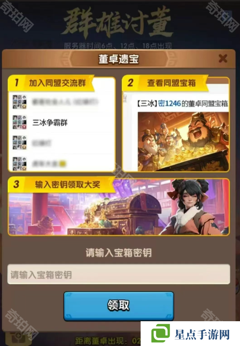 之前是不能获得宝箱奖励和领取的,现在改了,打下宝箱会出现一个董卓宝箱密钥,可以直接把密码分享到同盟和群里,App玩家可以在页面那里按领取可以输入小程序分享的密钥密码,获得宝箱。