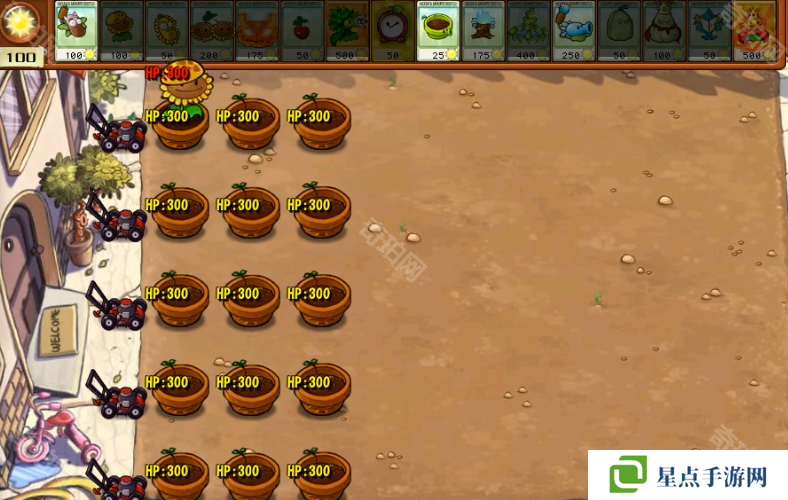 1、在这一关中默认有3排花盆,我们优先种植2排向日葵来获得阳光