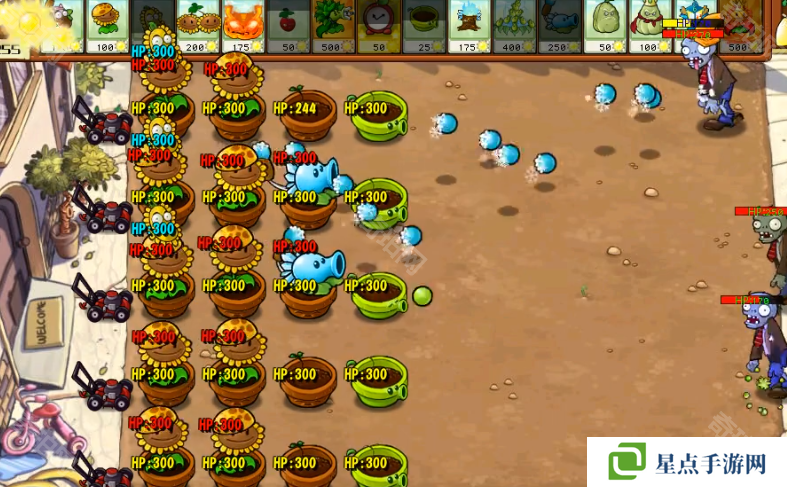 2、僵尸逐渐逼近时可以开始放置豌豆射手花盆和寒冰投手