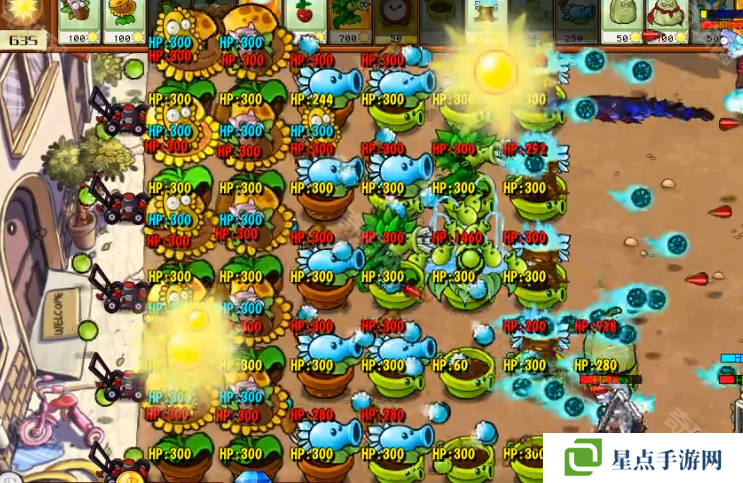3、最后我们保证2排向日葵,2排寒冰投手,1排火炬即可过关,除了关卡自带的花盆,我们全部种下豌豆射手花盆