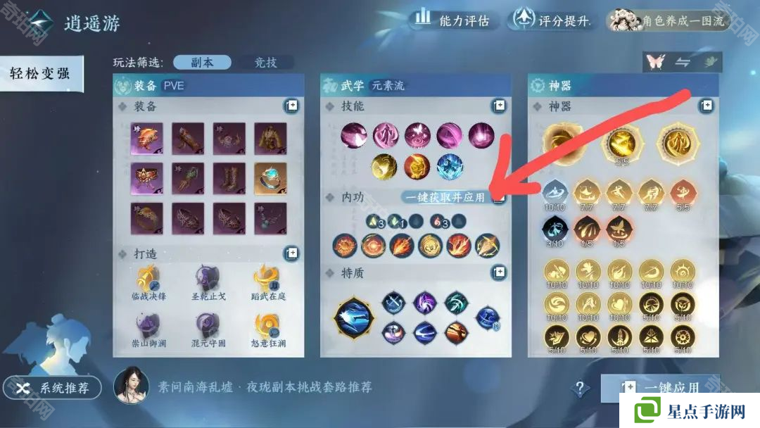 3、经过前两个步骤后,我们会来到如图所示的界面,然后点击箭头所指的【一键获取并应用】,如果要火系的新稀有内功在玩法筛选选择【副本】即可,如果要木系的新稀有内功选择【竞技】即可。