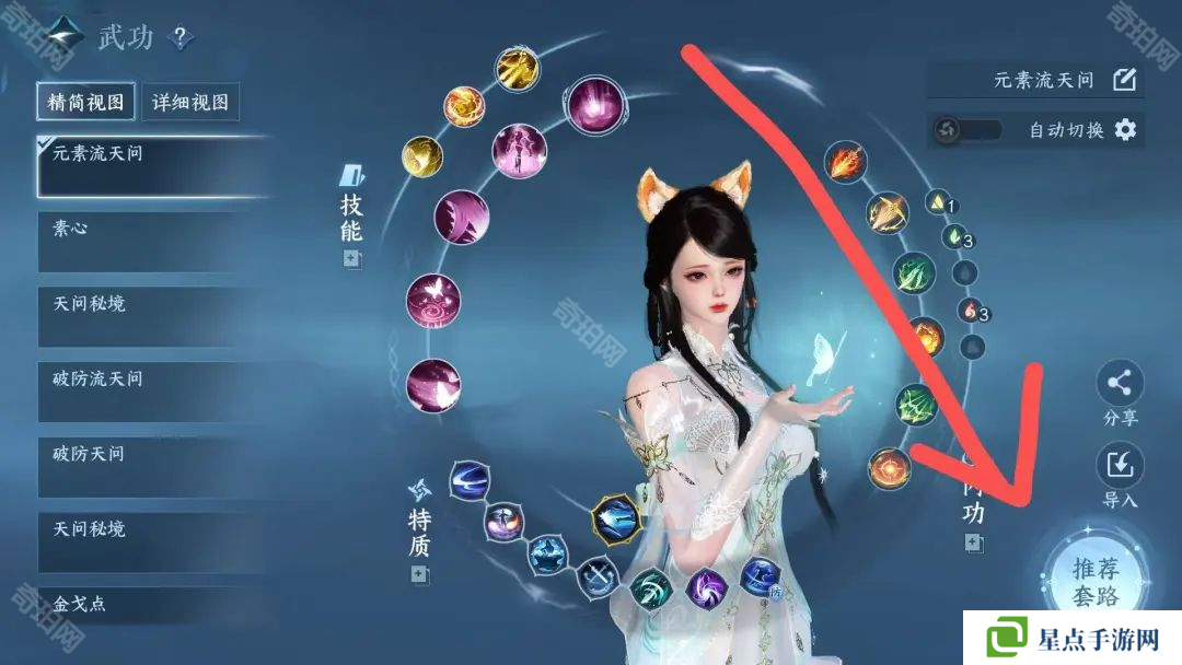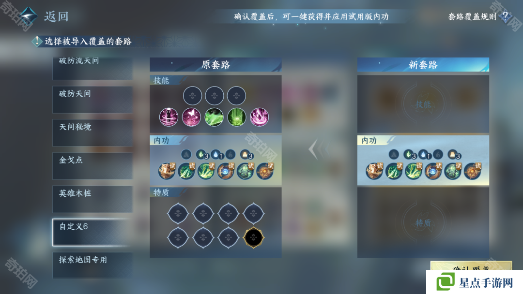 4、随便选择一个用不上的套路,覆盖后,就可以获得一整套同样词条的内功啦!里面是包含新的稀有内功的,然后再回到正常套路,选择需要新内功的套路带上就行啦!(比如素问可以直接拥有4木元素的新稀有内功,搭配副本木水套,就不用自己切内功了)。
