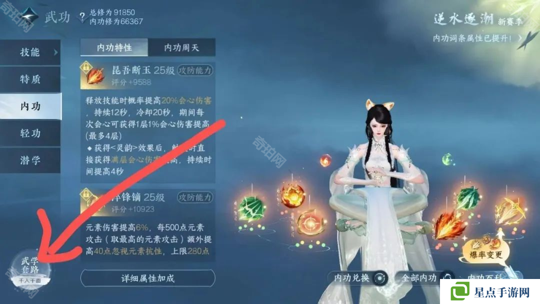 1、打开内功面板,然后点击左下角的【武学套路】。