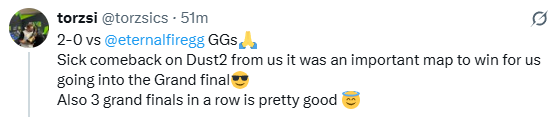 我们在Dust2上的精彩逆转非常重要,这场胜利为我们挺进总决赛奠定了良好基础