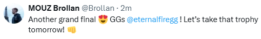 Brollan:另一场总决赛。GG Eternal Fire!让我们明天拿下奖杯吧!