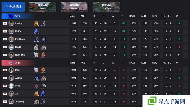 图一莲华古城13:3,图二亚海悬城13:8 ,DRX直落两盘轻取DFM,小组赛取得两连胜。此役free1ng选手表现出色,拿到全场最高的45总击杀,全场ACS来到了惊人的318。