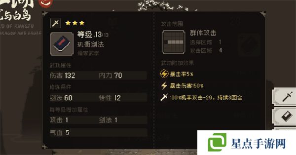 该剑法的特殊效果是每次攻击时,有5%的概率降低敌人攻击数值,最高可以降低敌人的攻击力29点,几乎让敌人失去攻击能力。