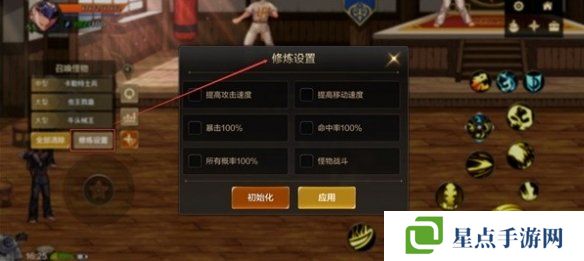 场内还有【全部清除】可以清除怪物,以及【修炼设置】,并且提供六种模式:“提升攻击速度”、“提升移动速度”、“百分百暴击”、“百分百命中”、“所有几率百分百”和“怪物战斗”。