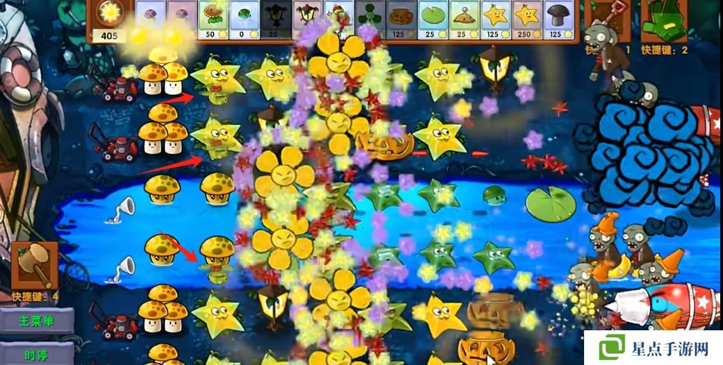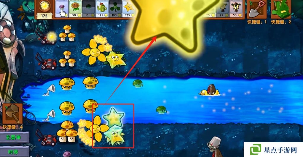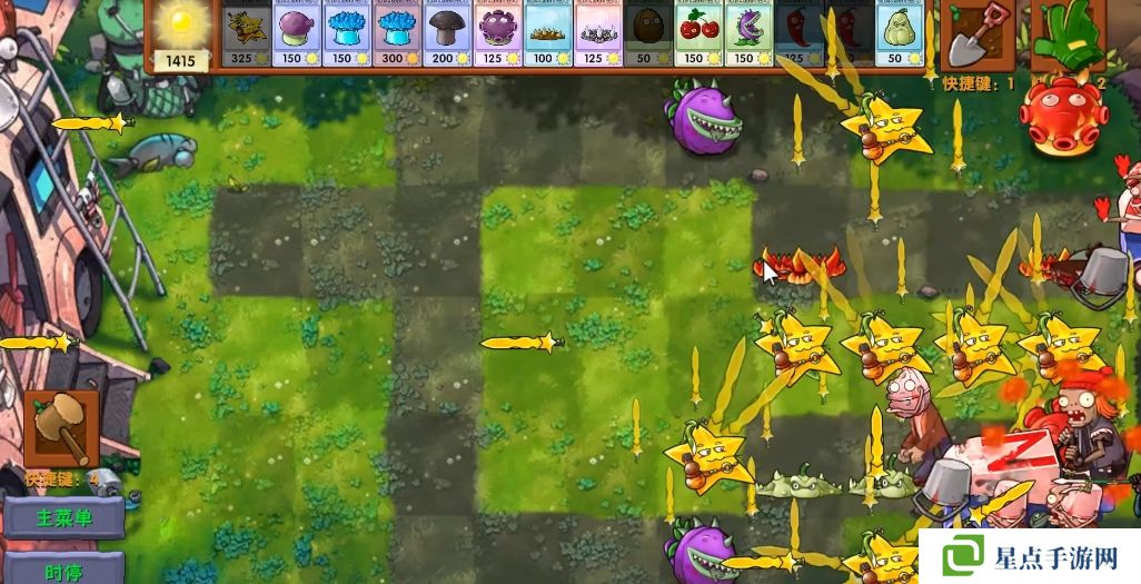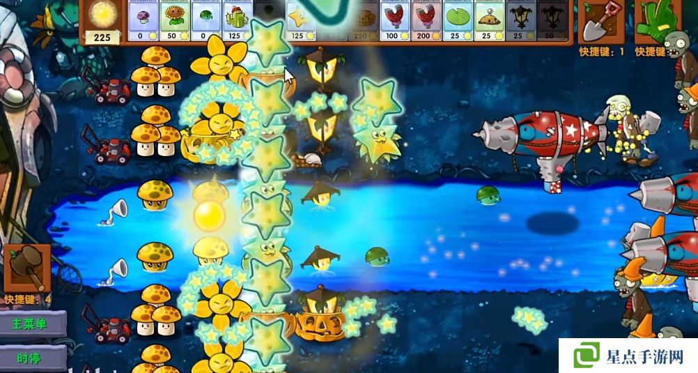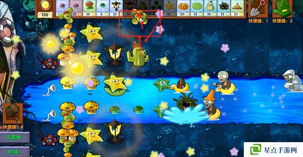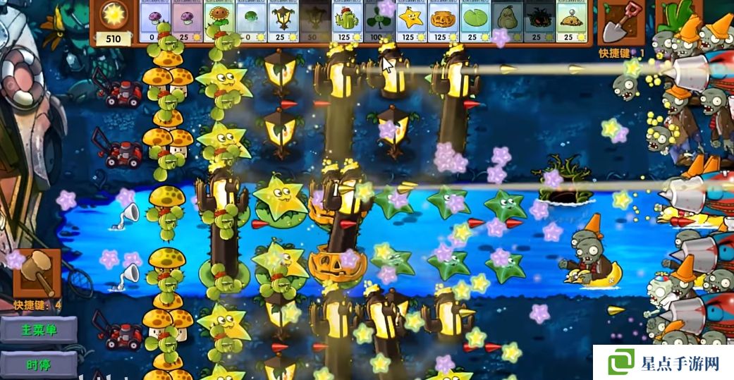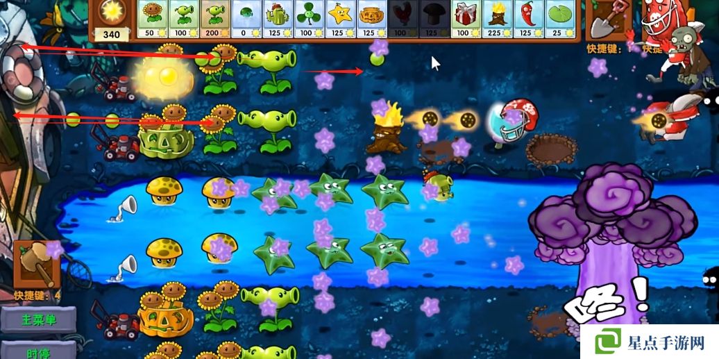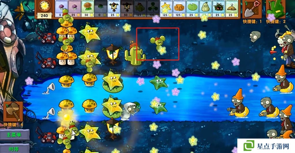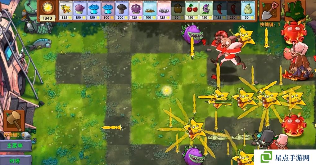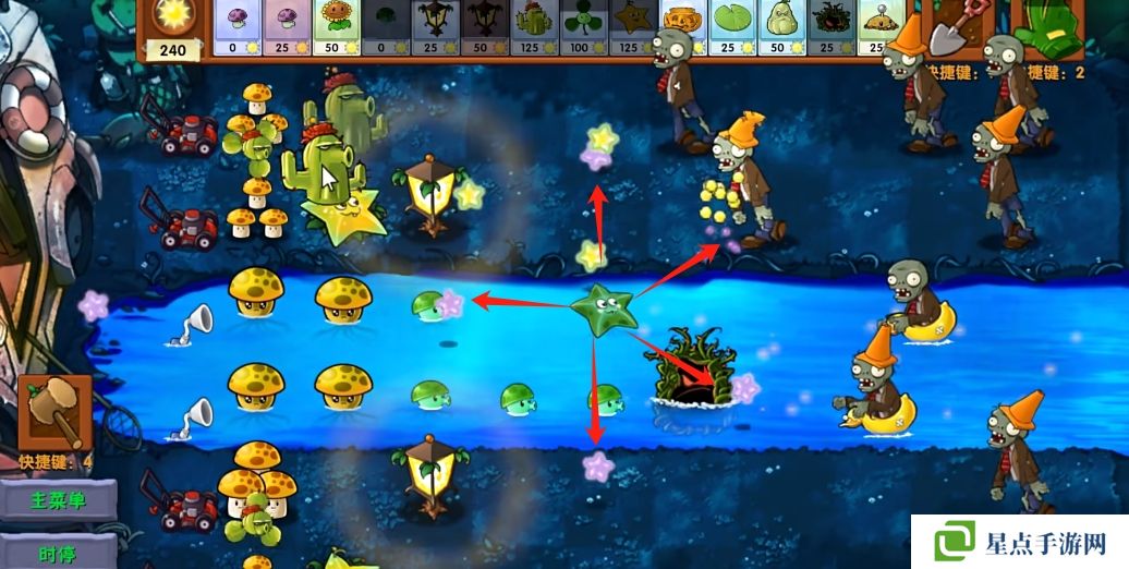 5、海星射手的星星是四散攻击的,有了仙人掌杨桃可以帮助星星回来向僵尸方向进行攻击。