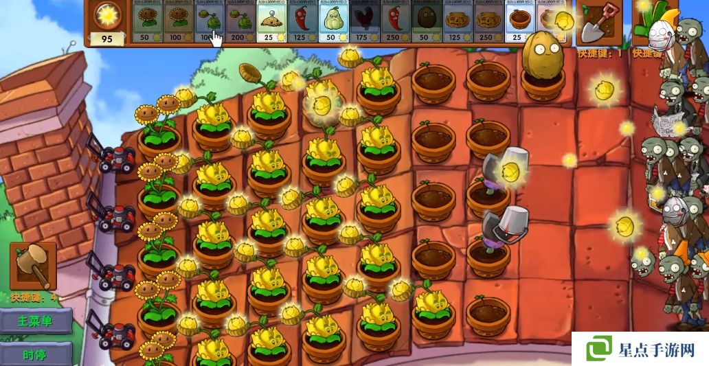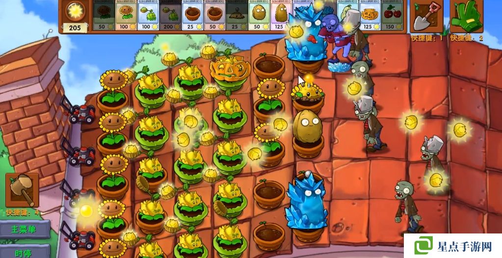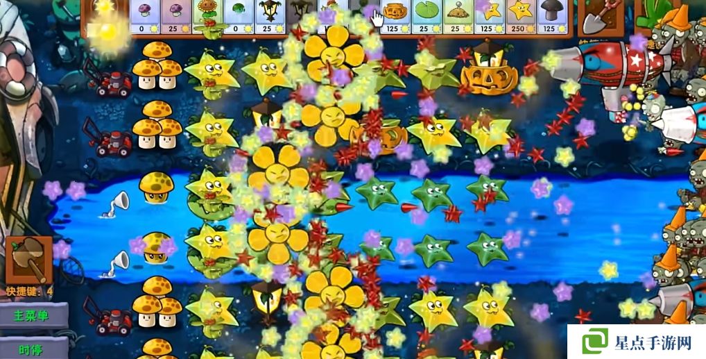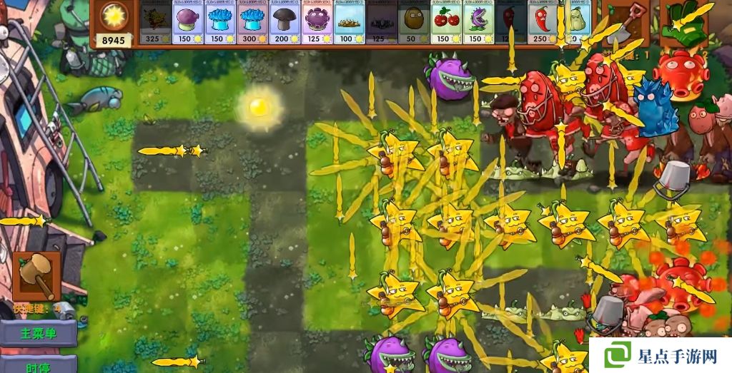 每隔一段时间可以生成一个大星星,向僵尸方向落下,变成几十颗星星攻击。