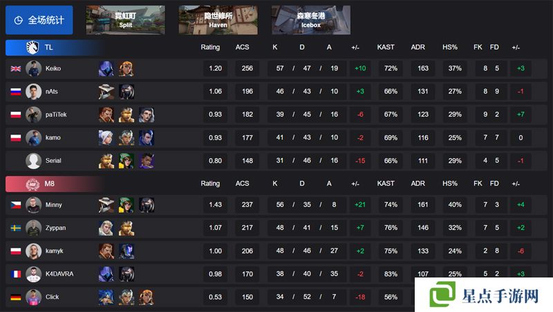 TL的拉脱维亚新援Serial首秀便打出糟糕的0.77 Rating、148的ACS和31杀的全场垫底数据。而从TL转会至M8的kamyk面对老东家则是毫不手软,砍下48杀证明自己。