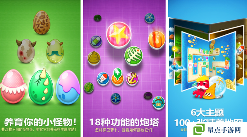 玩家在游戏中的主要任务是保卫萝卜,防止其被怪物吃掉,每个萝卜拥有 10 点生命值,即有10次被怪物“啃咬”的机会,一旦生命值降为0,则任务失败,为了守护萝卜,玩家需在怪物行进的路线上合理安置各种炮塔,利用炮塔攻击怪物,阻止它们靠近萝卜。