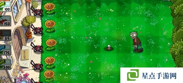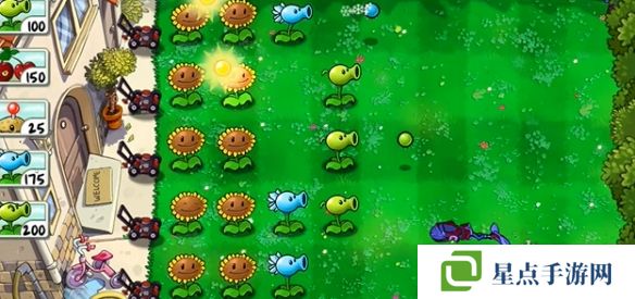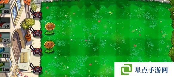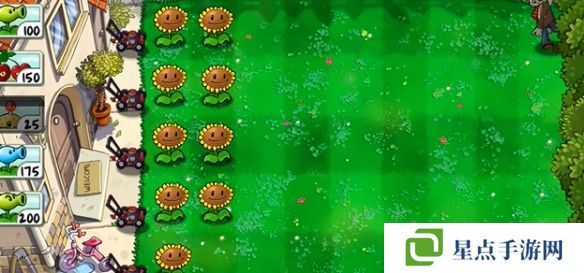 3、补齐左侧的一列向日葵,根据僵尸的位置种植土豆雷。
