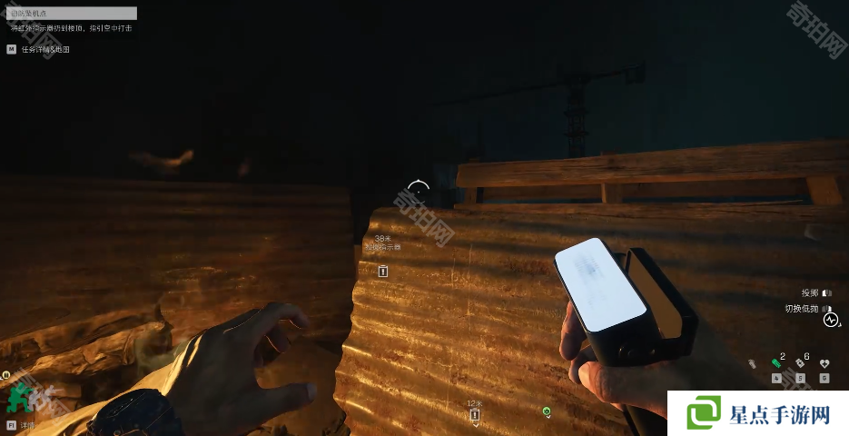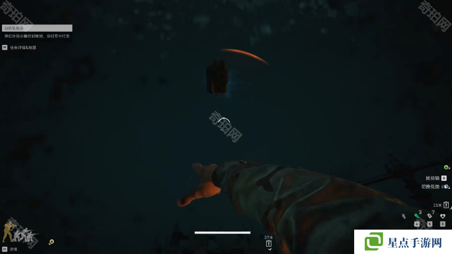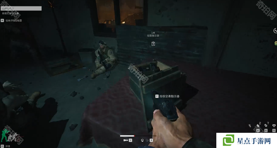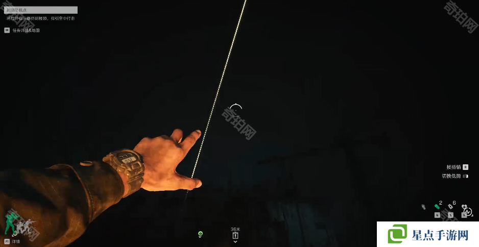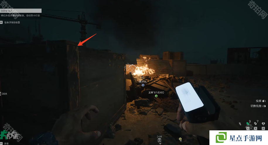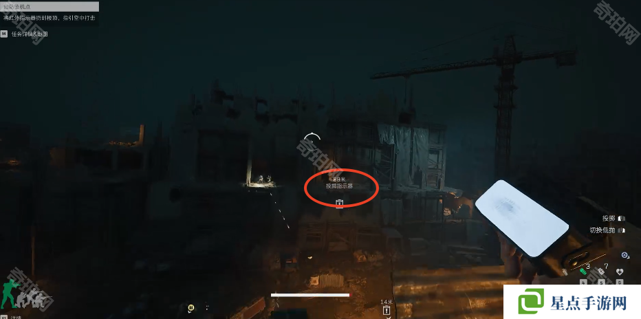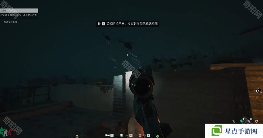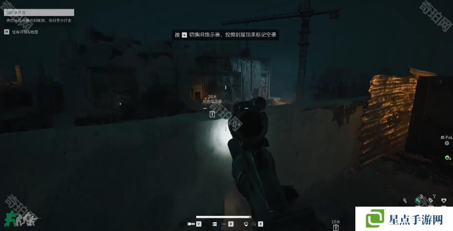 在我们左上角中提示我们将红外指示器扔到楼顶,指引空中打击