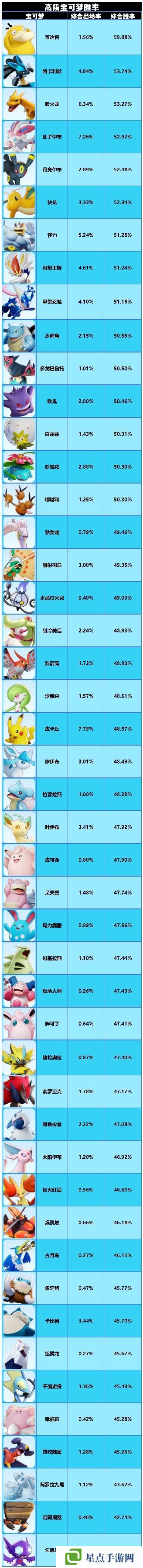 这个榜单反映了不同宝可梦角色在对战中的表现优劣,帮助玩家了解哪些角色在当前版本中更为强势,